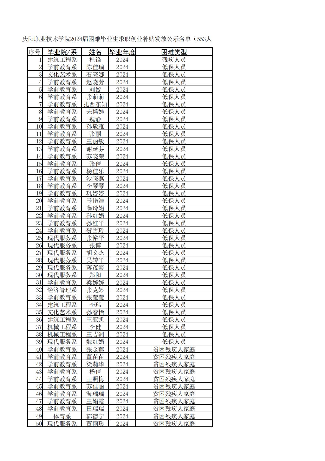 附:bwin必赢2024届困难毕业生求职创业补贴发放名单(553人)