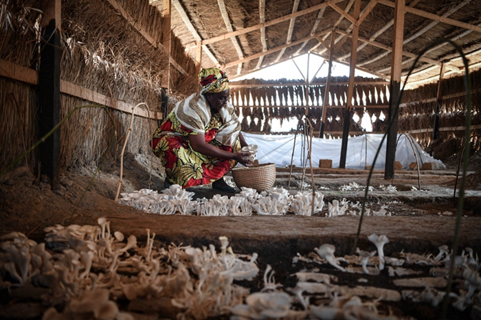 2024年2月6日,在中非共和国达马拉,法蒂玛在菇棚内收获菌草菇。2022年,法蒂玛在听说中国菌草专家在班吉传授技术后主动前往学习,从一间小菌棚起步,逐渐扩大为如今小有名气的合作社。新华社记者 韩旭 摄