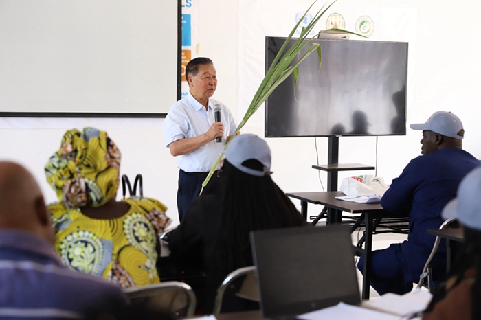 2024年8月4日,在位于卢旺达南方省胡耶区的中国援卢农业技术示范中心,菌草发明人林占熺为培训班学员讲解菌草技术。新华社发(黄万晴 摄)