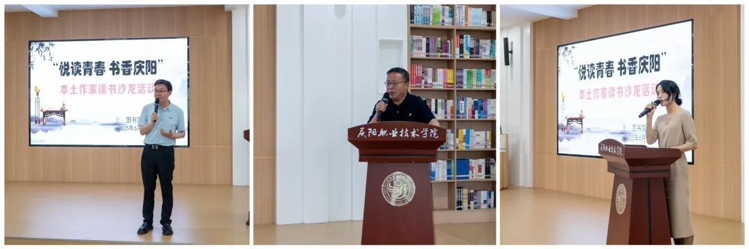 为持续推进书香高校建设,厚植广大师生人文情怀,营造爱读书、勤思考、会写作阅读环境,6月5日下午,学院图书馆、团委联合在文化交流中心成功举办“悦读青春、书香庆阳”本土作家读书沙龙活动,特邀本土作家付兴奎、段若兮、国家一级播音员宋飞与学院师生代表互动交流,展开对话。党委书记张建军参加活动并向本土作家颁发客座教授聘书,党委委员、副院长杨三宁致辞。各教学单位80名文学爱好者齐聚一堂,与本土作家面对面交流,感受文学的魅力,点燃阅读的热情。