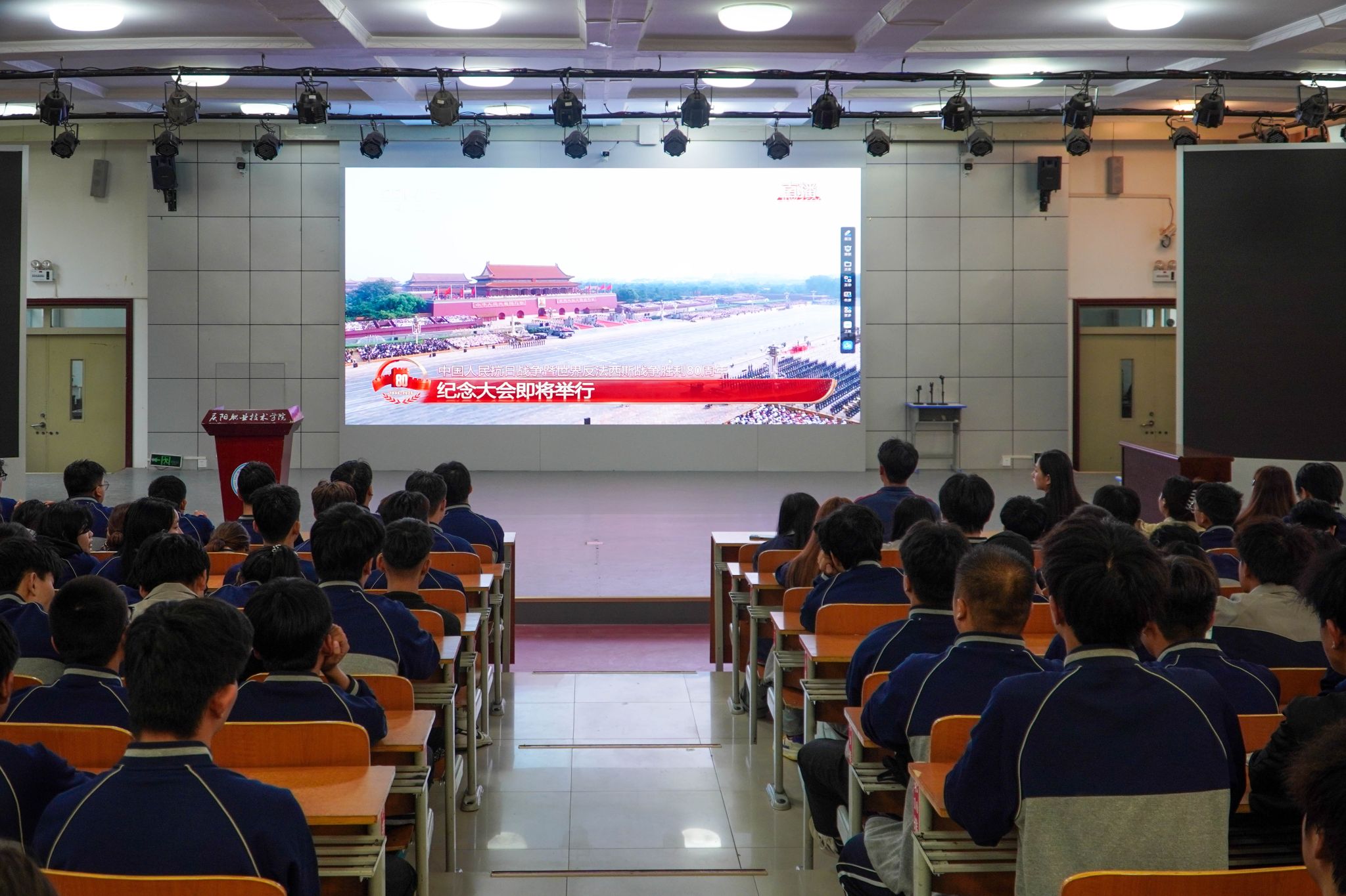 9月3日,纪念中国人民抗日战争暨世界反法西斯战争胜利80周年大会在京隆重举行,技师学院全体师生集中观看了纪念中国人民抗日战争暨世界反法西斯战争胜利80周年大会及阅兵式现场直播,以沉浸式学习教育,引导师生重温历史、缅怀先烈、凝聚奋进力量。
