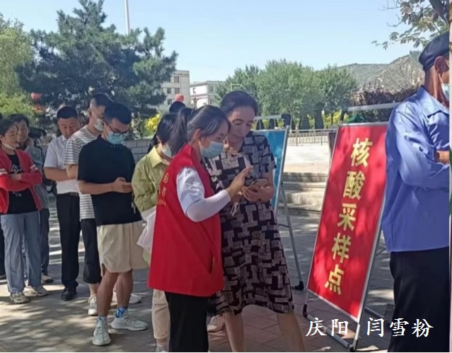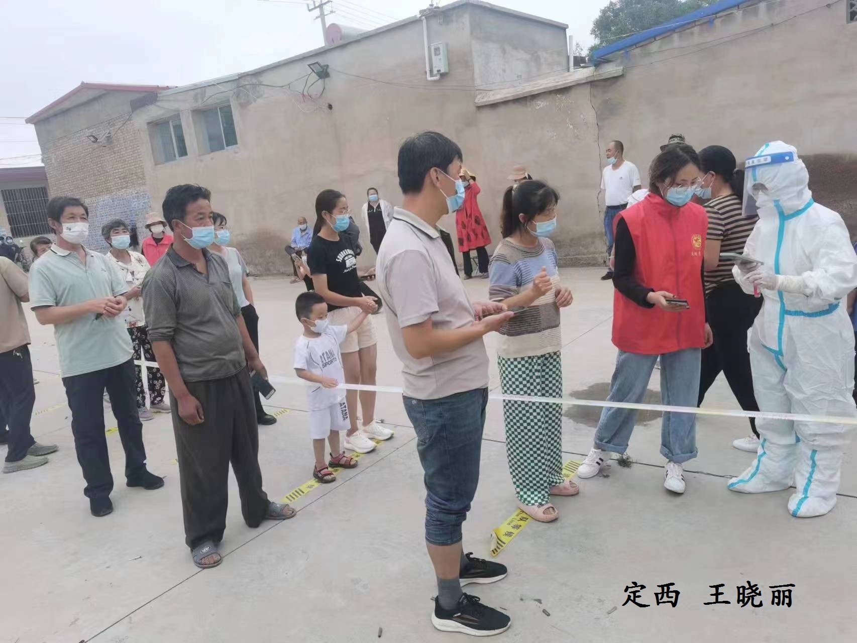 定西的王晓丽在临洮县八里铺镇做志愿者,协助医务人员做核酸检测,帮助老人及儿童申领健康码。