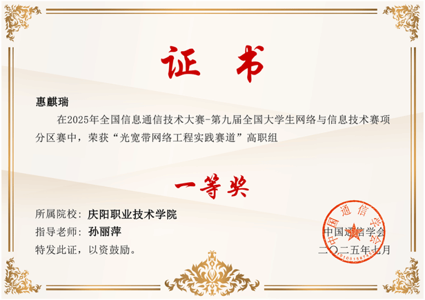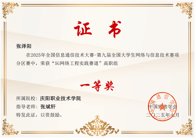 近日,2025年全国信息通信技术大赛总决赛在西安邮电大学举行,我院数字信息系2024级学生张泽阳、惠麒瑞分别在“5G网络工程实践”和“光宽带网络工程实践”赛道中荣获全国三等奖,展现出扎实的专业素养和实践能力。