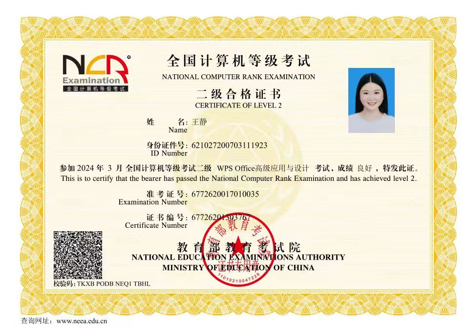 进入高职阶段后,王静始终践行学校“养习惯、爱读书、精专业、强本领”的学生管理规范,在学习与实践中全面提升自我。学习上,她延续着认真踏实的态度,大专一年级便成功考取国家计算机二级证书,用过硬的专业技能夯实成长根基。