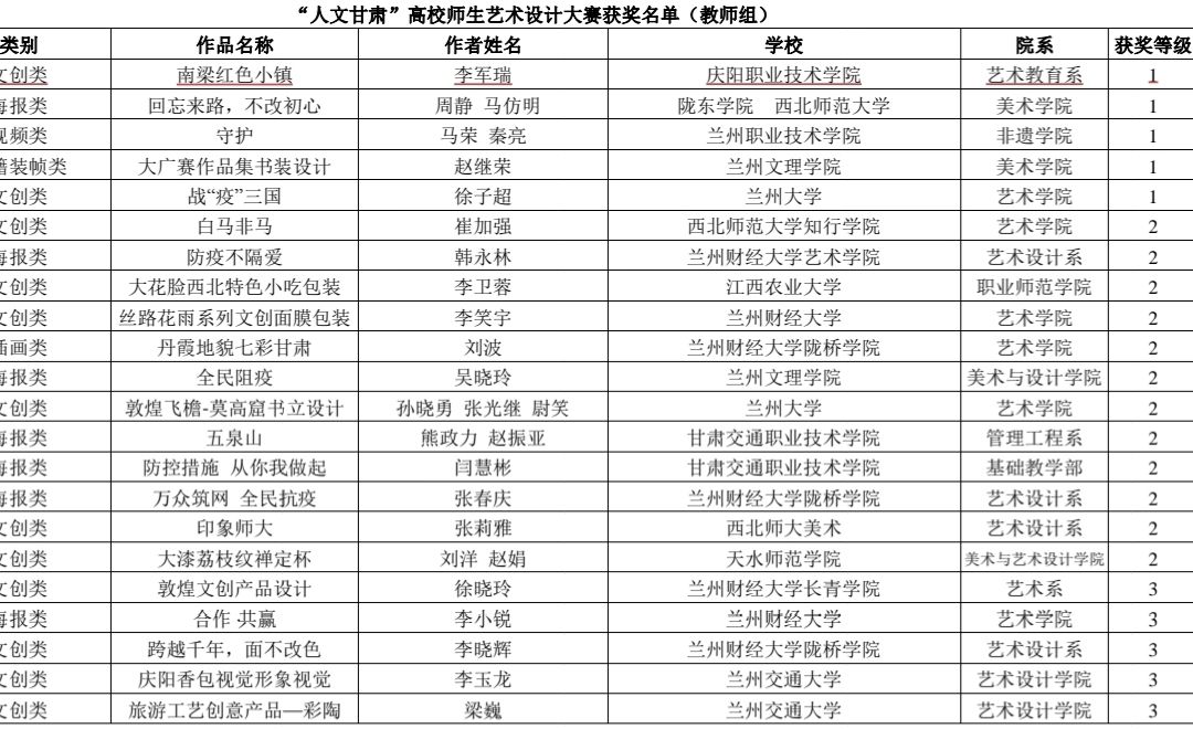 10月9日,我院艺术教育系教师李军瑞的文创设计作品《南梁小镇》从参赛的576件作品中脱颖而出,荣获省教育厅举办的“人文甘肃”艺术设计大赛高校教师组一等奖。具体获奖名单如下: