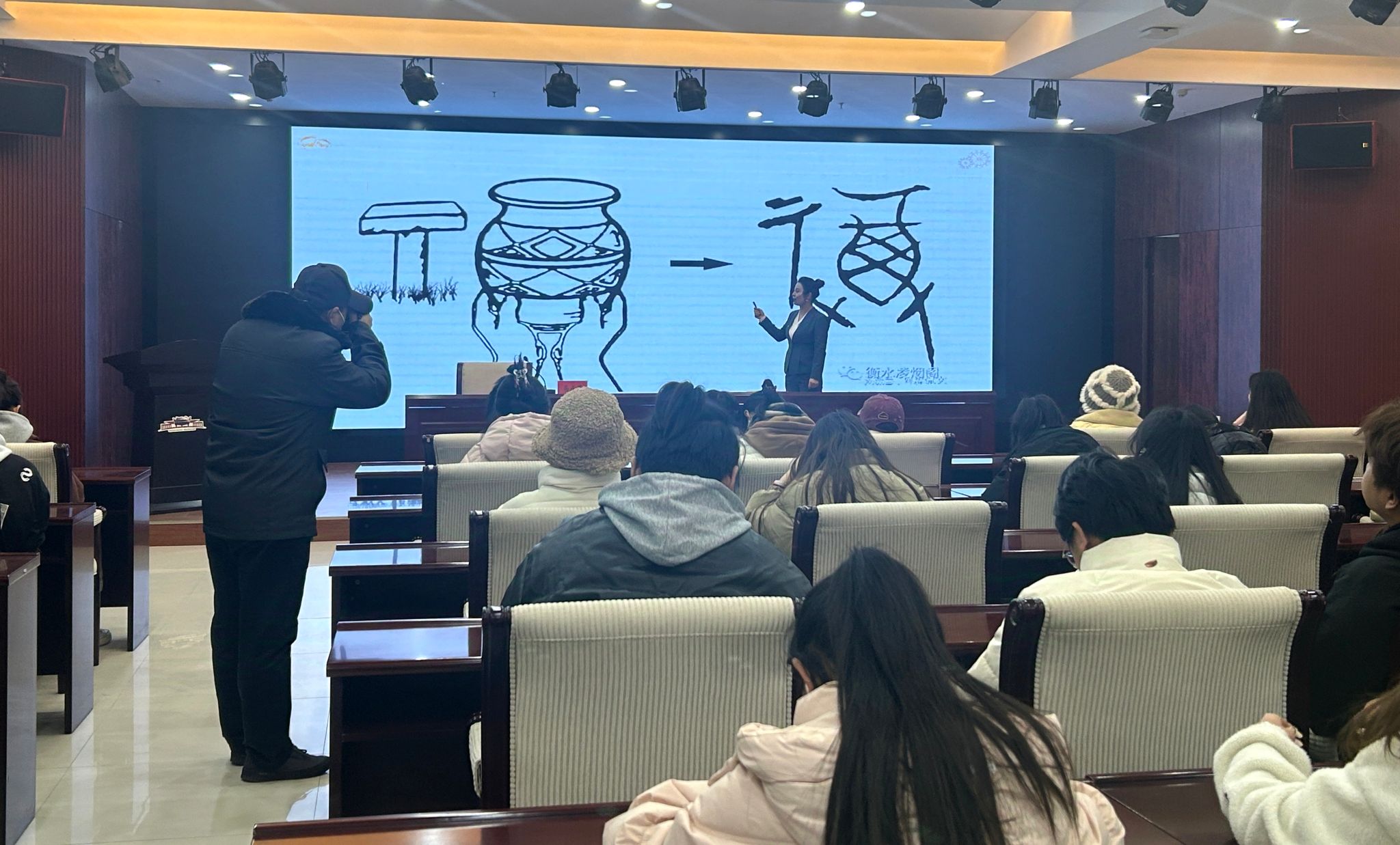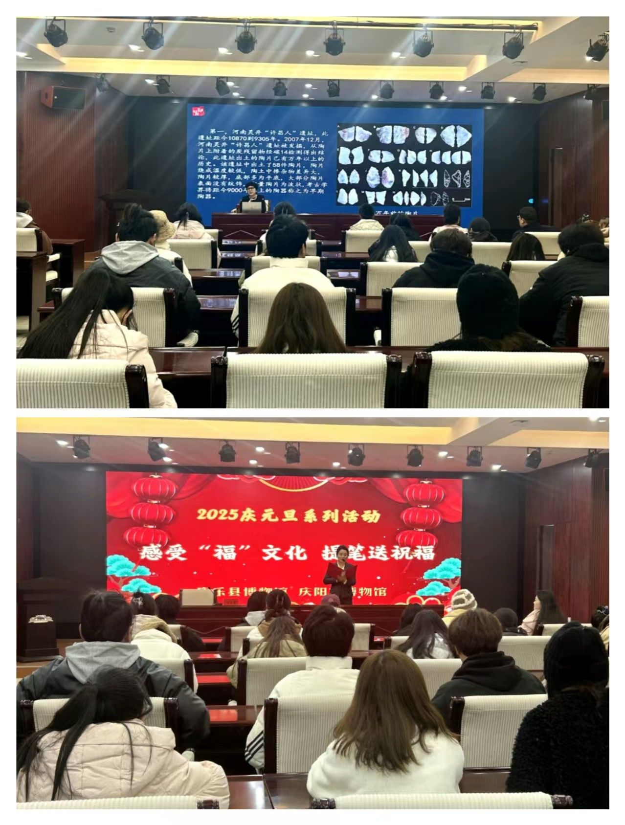 紧接着,康乐县博物馆马正芳馆长带来了一场主题为《绚丽的史前文化》的精彩讲座,深入浅出地为同学们解读了史前彩陶文化的奥秘与价值,让大家对彩陶文化的历史脉络和文化内涵有了更为深入的理解。随后的《感受“福”文化 提笔送祝福》书法实践活动中,同学们挥毫泼墨,将对文化的感悟与对生活的祝福倾注于笔端,在墨香中感受着传统文化的独特魅力。活动尾声,工作人员还为同学们精心准备了蕴含甘肃彩陶文化元素的文创产品,这些设计精巧、造型独特的纪念品,不仅是对本次活动的美好留念,更是彩陶文化在现代社会的生动演绎。