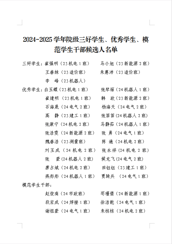 2024-2025学年院级三好学生、优秀学生、模范学生干部候选人名单